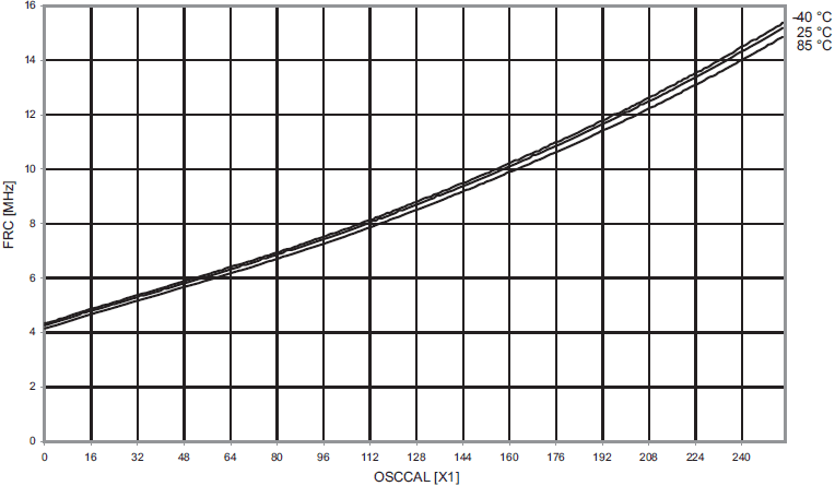 Częstotliwość oscylatora kalibrowanego w funkcji wartości OSCCAL