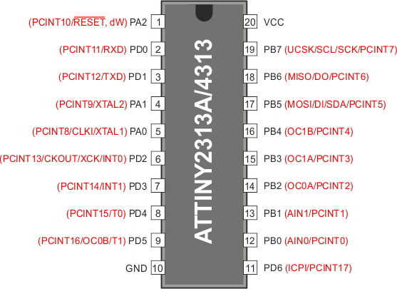 Wejście dla odwracającego wzmacniacza oscylatora i wejście dla układu wewnętrznego zegara roboczego. XTAL1 jest funkcją alternatywną końcówki PA0.