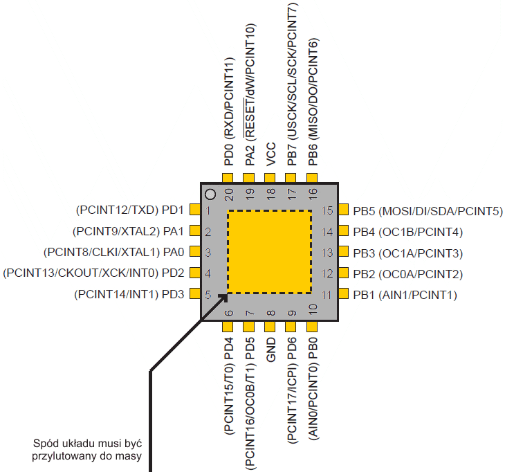 Krótsze impulsy nie dają gwarancji wygenerowania resetu. Wejście resetowania jest funkcją alternatywną końcówki PA2 i dW.