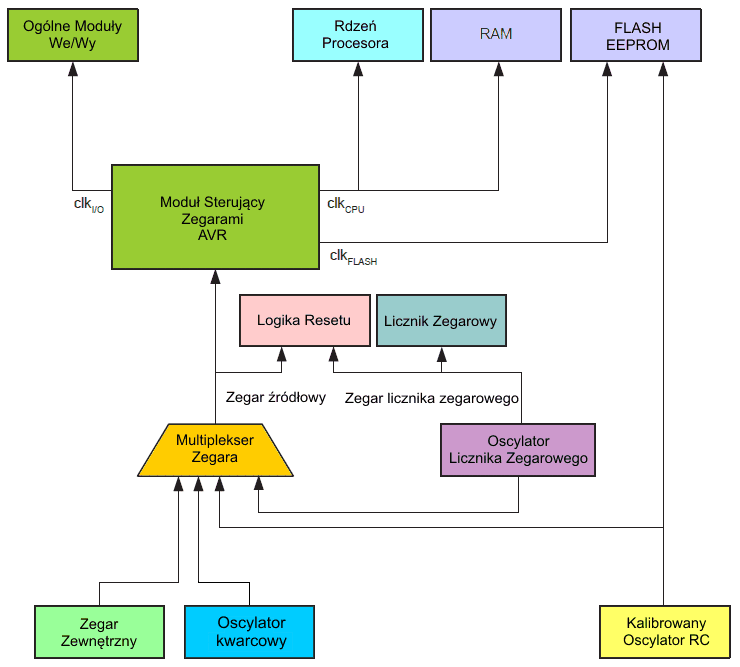 W poprzednim rozdziale znajduje się poniższy rysunek przedstawiający różne systemy zegarowe i ich przydział w mikrokontrolerze ATtiny2313A/4313.