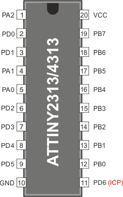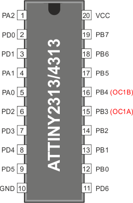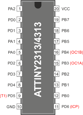 Końcówki portów współpracujące z timerem/licznikiem 1 w mikrokontrolerze ATtiny2313A/4313 są następujące: