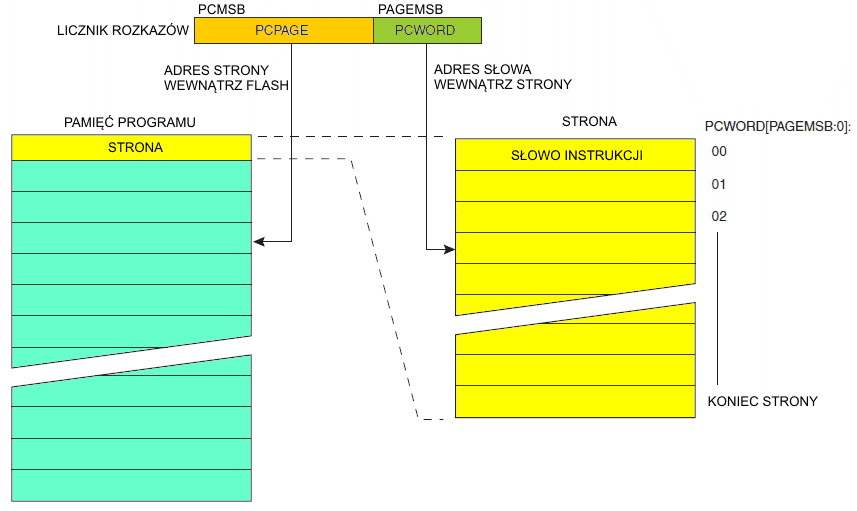 | Mikrokontroler | Rozmiar FLASH | Rozmiar strony | PCWORD | Strony | PCPAGE | PCMSB |