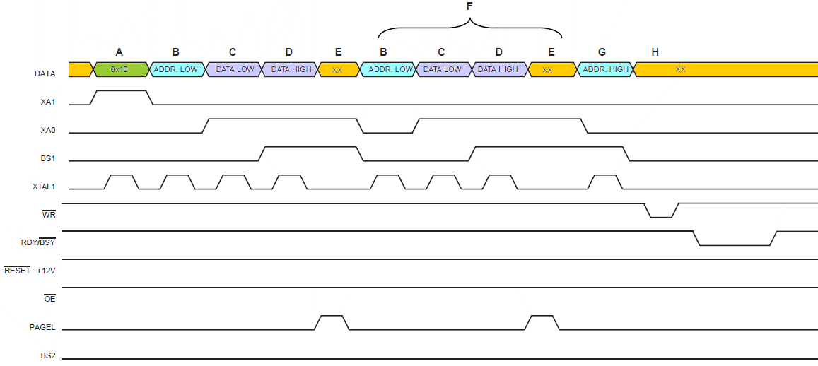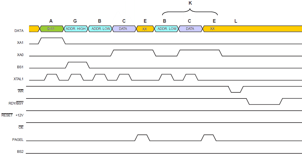 Przebiegi w programowaniu EEPROM są zilustrowane na poniższym rysunku. XX oznacza "wartość nieistotną", a litery odnoszą się do opisanych wcześniej kroków programowania.