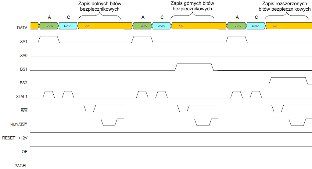 Poniższy rysunek ilustruje przebiegi sygnałów przy programowaniu bitów bezpiecznikowych. XX oznacza "wartość nieistotną", a litery odnoszą się do opisanych wcześniej kroków programowania.
