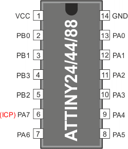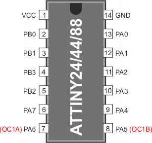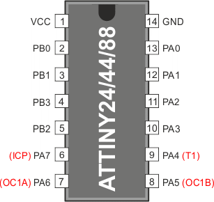 Końcówki portów współpracujące z timerem/licznikiem 1 w mikrokontrolerze ATtiny24/44/84 są następujące: