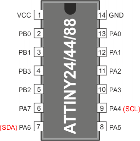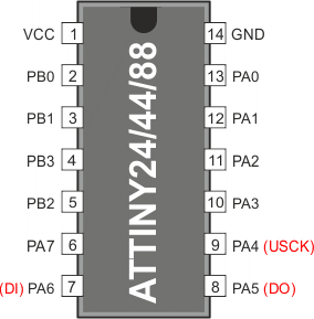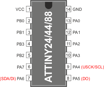 Interfejs USI wykorzystuje następujące końcówki mikrokontrolera ATtiny24/44/84: