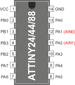 Komparator analogowy (ang. Analog Comparator) porównuje wartości wejściowe na nieodwracającej końcówce AIN0 (ang. Analog Input, wejście analogowe) oraz na odwracającej końcówce AIN1: