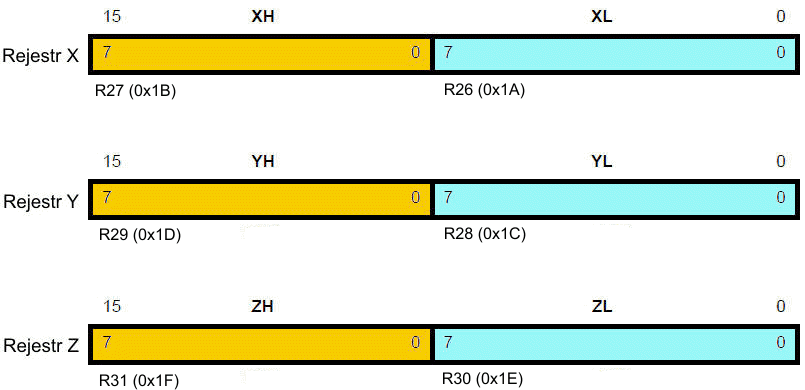 Rejestry R26...R31 posiadają dodatkowe funkcje oprócz ich ogólnego zastosowania. Tworzą one 16-bitowe wskaźniki do adresowania pośredniego obszaru danych. Trzy rejestry adresowania pośredniego X, Y i Z są zdefiniowane tak, jak pokazano na poniższym rysunku: