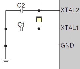 Końcówki XTAL1 i XTAL2 są odpowiednio wejściem i wyjściem odwracającego wzmacniacza, który można skonfigurować do użytku jako wewnątrzukładowy oscylator, co pokazuje poniższy rysunek: