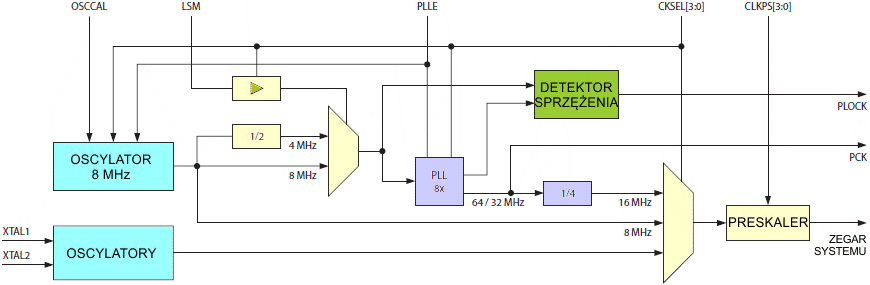Wewnętrzna pętla PLL w ATtiny25/45/85 generuje częstotliwość zegarową osiem razy wyższą od źródłowej częstotliwości wejściowej. Standardowo pętla PLL wykorzystuje jako źródło wyjście wewnętrznego oscylatora RC 8 MHz. Alternatywnie po ustawieniu bitu LSM w rejestrze PLLCSR pętla PLL będzie wykorzystywać wyjście oscylatora RC podzielone przez 2. Stąd jako wyjście z PLL zegar szybkich peryferiów ma częstotliwość 64MHz. Zegar ten lub zegar preskalowany z tej wartości może zostać wybrany na źródło zegarowe dla timera/licznika 1 lub jako zegar systemowy. Zobacz na rysunek poniżej. Częstotliwość zegara szybkich peryferiów jest dzielona przez dwa, gdy zostanie ustawiony bit LSM w rejestrze PLLCSR, co da w wyniku częstotliwość 32MHz. Zwróć uwagę, iż bitu LSM nie można ustawić, jeśli zegar PLLCLK jest używany jako zegar systemowy.