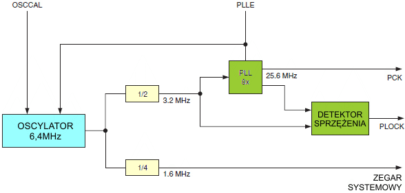 Zwróć uwagę, iż preskaler zegara systemowego może być używany do implementacji w trakcie pracy zmian częstotliwości wewnętrznego zegara przy jednoczesnym zapewnieniu stabilnego działania.