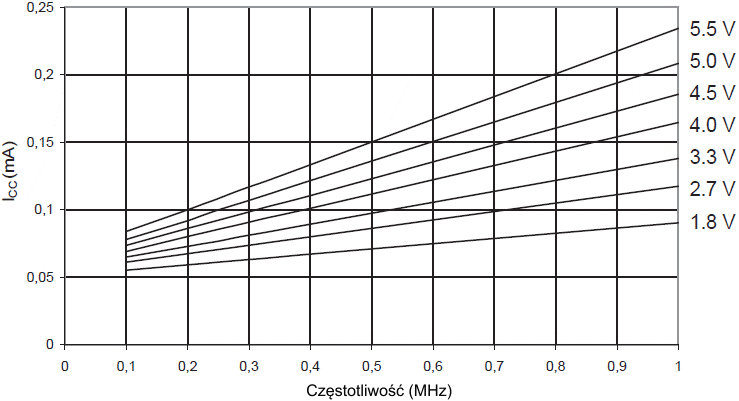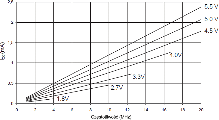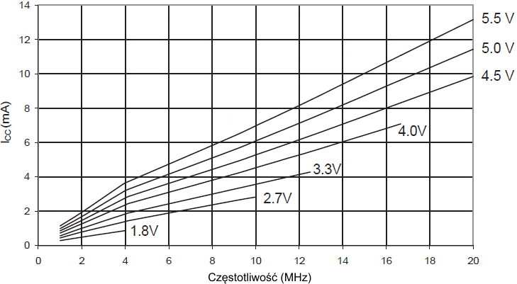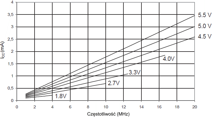 Można również policzyć typowy pobór prądu na podstawie liczb w powyższych tabelkach dla innego VCC i dla innej częstotliwości.