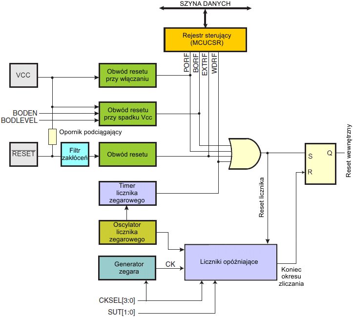 Po ustąpieniu wszystkich źródeł resetu włączany jest licznik opóźniający, który rozciąga wewnętrzny reset. Pozwala to napięciu zasilającemu osiągnąć stabilny poziom przed rozpoczęciem normalnej pracy. Okres zliczania licznika opóźniającego jest definiowany przez użytkownika poprzez bity bezpiecznikowe CKSEL.