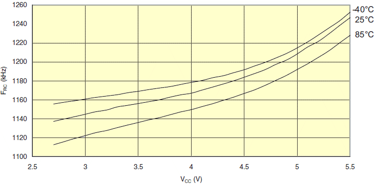 Timer licznika zegarowego jest taktowany z osobnego, wbudowanego w układ oscylatora, który pracuje z częstotliwością 1 MHz. Jest to typowa wartość przy VCC = 5V. Zobacz na Parametry tego oscylatora przy innych poziomach VCC: