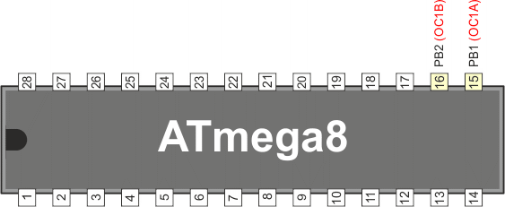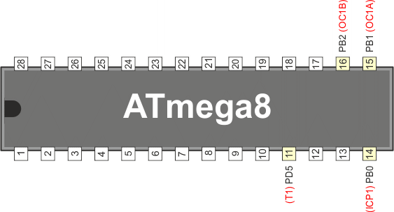 Końcówki portów współpracujące z timerem/licznikiem 1 w mikrokontrolerze ATmega8 są następujące: