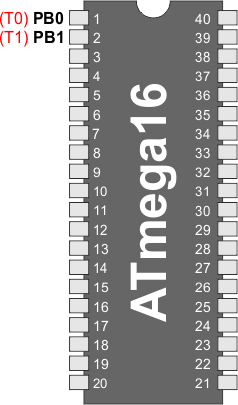 Zewnętrzne źródło zegarowe doprowadzone do końcówki T1/T0 pin może zostać użyte jako zegar timera/licznika (clkT1/clkT0). Końcówka T1/T0 jest próbkowana raz przy każdym takcie zegara systemowego przez sieć logiczną synchronizacji końcówki. Zsynchronizowany sygnał (spróbkowany) jest następnie przekazywany do detektora zbocza. Poniższy rysunek pokazuje funkcjonalnie równoważny schemat blokowy sieci logicznej detektora zbocza. Rejestry są taktowane przy dodatnim zboczu wewnętrznego zegara systemowego (clkI/O). Przerzutnik latch jest przezroczysty dla górnej połówki okresu wewnętrznego zegara systemu.