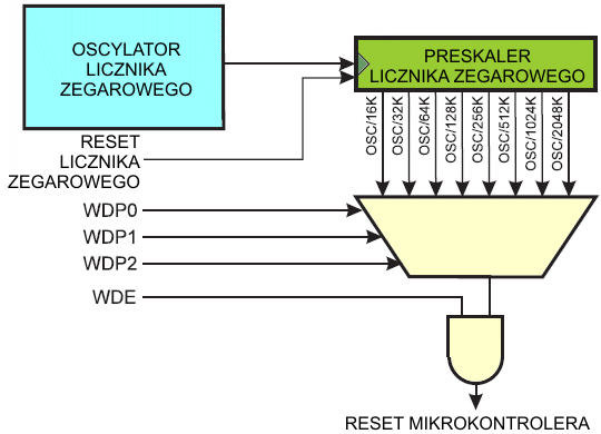 | WDP2 | WDP1 | WDP0 | Liczba cykli oscylatora | Typowy czas zliczania dla VCC = 3,0 V | Typowy czas zliczania dla VCC = 5,0 V |
