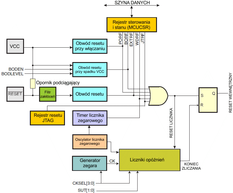 Po ustąpieniu wszystkich źródeł resetu włączany jest licznik opóźniający, który rozciąga wewnętrzny reset. Pozwala to napięciu zasilającemu osiągnąć stabilny poziom przed rozpoczęciem normalnej pracy. Okres zliczania licznika opóźniającego jest definiowany przez użytkownika poprzez bity bezpiecznikowe CKSEL.