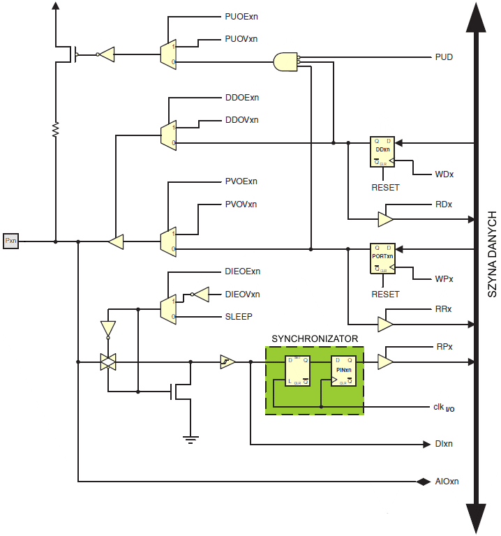 | Uwaga: | Sygnały WPx, WDx, RRx, RPx i RDx są wspólne dla wszystkich końcówek wewnątrz tego samego portu. Sygnały clkI/O, SLEEP i PUD są wspólne dla wszystkich portów. Wszystkie pozostałe sygnały są indywidualne dla każdej końcówki. |