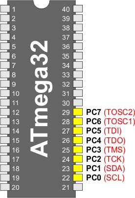 SCL: Zegar 2-przewodowego interfejsu szeregowego. Gdy zostanie ustawiony bit TWEN w rejestrze TWCR w celu włączenia 2-przewodowego interfejsu szeregowego, końcówka PC0 zostaje odłączona od portu i staje się końcówką we/wy zegara szeregowego. W tym trybie końcówka otrzymuje filtr zakłóceń impulsowych, który eliminuje w sygnale wejściowym szpilki krótsze niż 50 ns, a końcówka jest wysterowywana przez drajwer z otwartym drenem z ograniczeniem szybkości zmian. Gdy końcówka jest wykorzystywana przez 2-przewodowy interfejs szeregowy, opornik podciągający wciąż można kontrolować bitem PORTC0 rejestru PORTC.