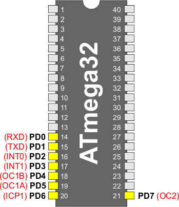 RXD: Dane odbierane (końcówka wejścia danych dla USART). Gdy zostanie włączony odbiornik USART, końcówka ta będzie skonfigurowana jako wejście bez względu na wartość bitu DDD0 rejestru DDRD. Gdy USART wymusza tryb pracy końcówki jako wejście, opornik podciągający można wciąż kontrolować bitem PORTD0 rejestru PORTD.