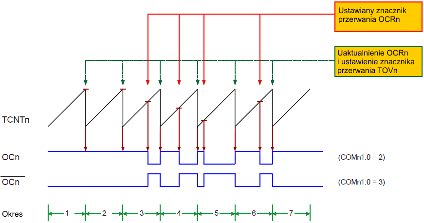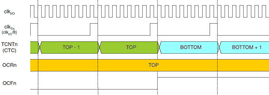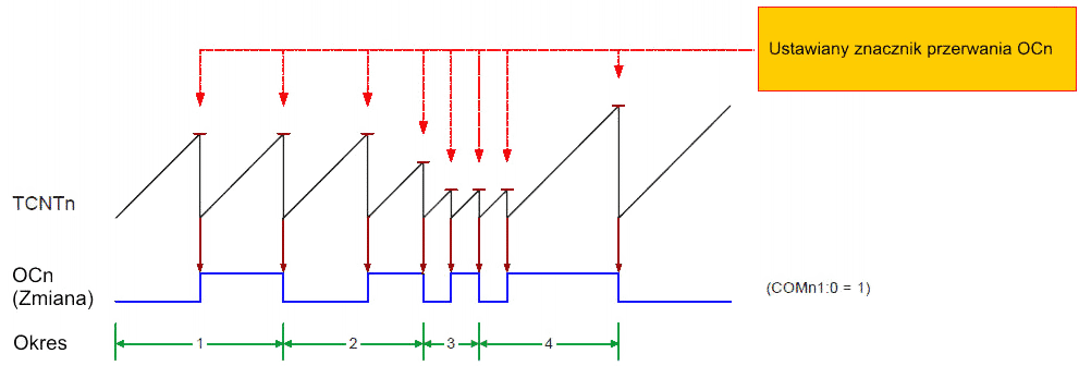 Tak samo jak w trybie normalnym znacznik TOV0 jest ustawiany w tym samym cyklu zegara timera, gdy licznik zmienia stan z MAX na 0x00.