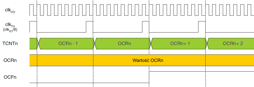 Wykres czasowy dla trybu CTC jest pokazany na poniższym rysunku. Wartość licznika (TCNT0) zwiększa się aż do pojawienia się zgodności porównania z OCR0, a wtedy licznik (TCNT0) jest zerowany.