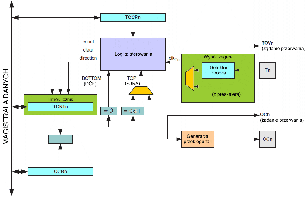 Poniżej przedstawiono uproszczony schemat blokowy 8-bitowego timera/licznika. Rejestry dostępne dla mikroprocesora, łącznie z bitami we/wy i końcówkami we/wy, są zapisane tłustym drukiem.