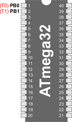 Zewnętrzne źródło zegarowe doprowadzone do końcówki T1/T0 pin może zostać użyte jako zegar timera/licznika (clkT1/clkT0). Końcówka T1/T0 jest próbkowana raz przy każdym takcie zegara systemowego przez sieć logiczną synchronizacji końcówki. Zsynchronizowany sygnał (spróbkowany) jest następnie przekazywany do detektora zbocza. Poniższy rysunek pokazuje funkcjonalnie równoważny schemat blokowy sieci logicznej detektora zbocza. Rejestry są taktowane przy dodatnim zboczu wewnętrznego zegara systemowego (clkI/O). Przerzutnik latch jest przezroczysty dla górnej połówki okresu wewnętrznego zegara systemu.