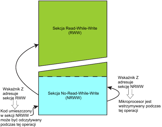Kod umieszczony w sekcji NRWW może być odczytywany podczas uaktualniania strony w sekcji RWW przez oprogramowanie boot-loadera. Gdy kod boot-loadera uaktualnia sekcję NRWW, mikroprocesor zostaje zatrzymany podczas całej operacji wymazywania lub zapisu strony.