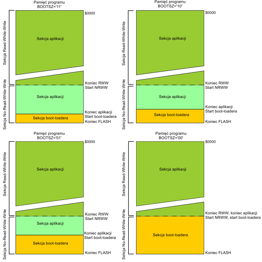 | BOOTSZ1 | BOOTSZ0 | Rozmiar sekcji boot-loadera | Strony | Sekcja FLASH aplikacji | Sekcja FLASH boot-loadera | Koniec sekcji aplikacji | Adres Resetu w sekcji boot-loadera |