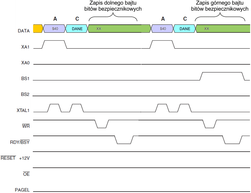 | Uwagi: | 1. | Zaprogramuj bity bezpiecznikowe przed zaprogramowaniem bitów blokujących |