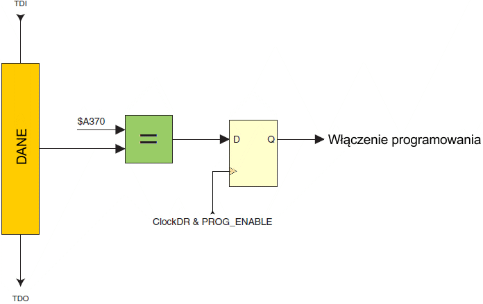 Rejestr ten jest wirtualnym łańcuchem skanowania o długości równej liczbie bitów w jednej stronie pamięci FLASH. Wewnętrznie rejestr przesuwający jest 8-bitowy, a dane są automatycznie przenoszone bajt po bajcie do bufora strony FLASH. Wsuń wszystkie słowa instrukcji w stronie, rozpoczynając od najmłodszego bitu LSB pierwszej instrukcji na stronie i kończąc najstarszym bitem MSB ostatnie instrukcji na stronie. Dostarcza to efektywnego sposobu załadowania całego bufora strony FLASH przed wykonaniem zapisu strony.