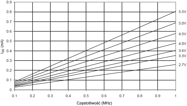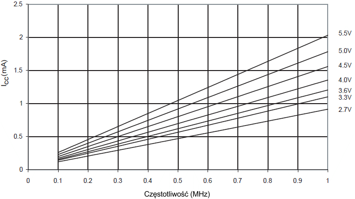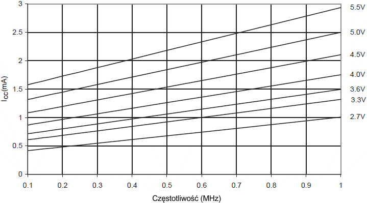 ![]() gdzie: CL = obciążająca pojemność VCC = napięcie robocze f = średnia częstotliwość przełączania końcówki we/wy |