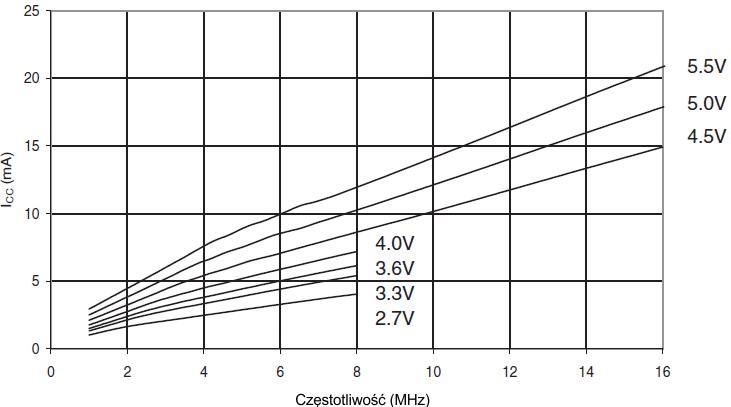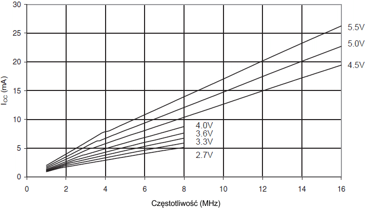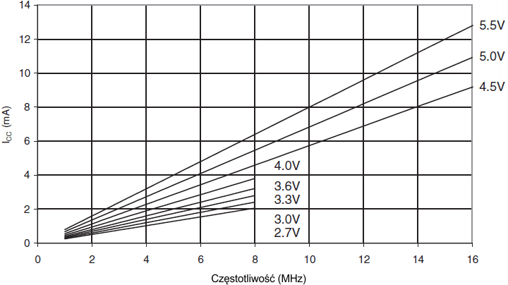16MHz, z wyłączeniem prądu płynącego przez opornik podciągający końcówki