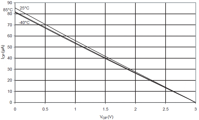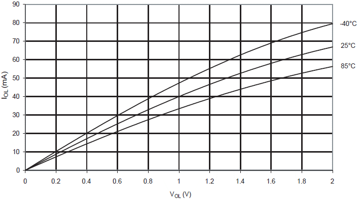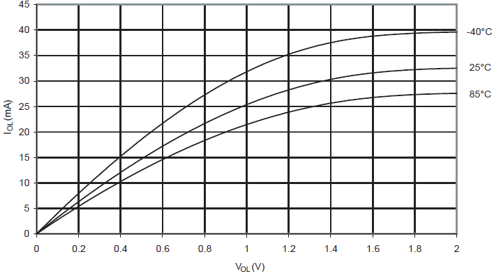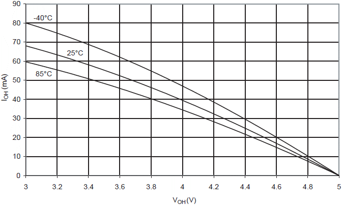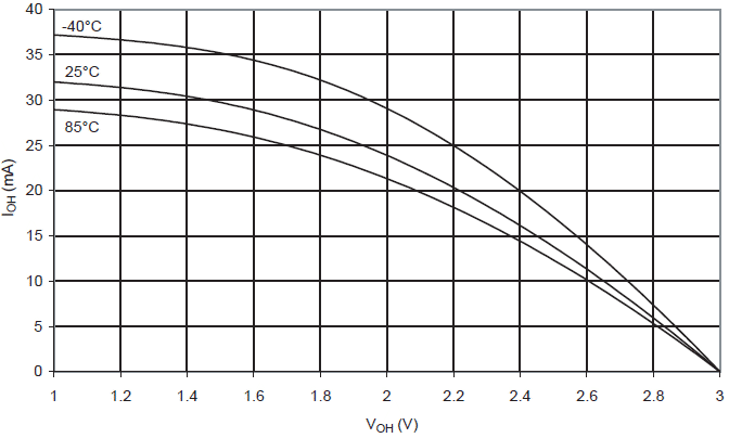 Prąd wypływający z końcówki we/wy w funkcji napięcia wyjściowego