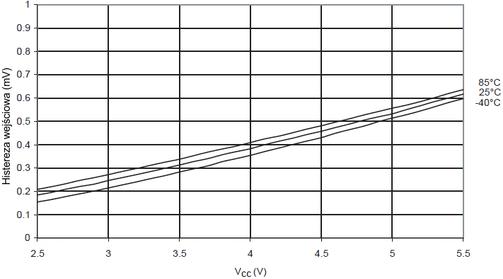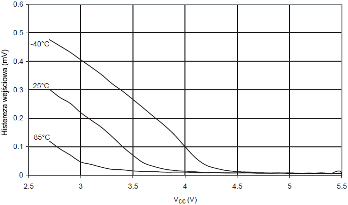 Histereza wejściowa końcówki we/wy w funkcji napięcia zasilającego VCC
