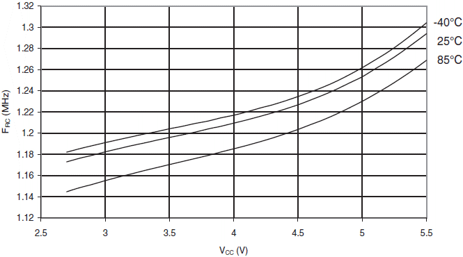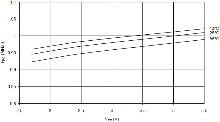 Częstotliwość kalibrowanego oscylatora RC 1MHz w funkcji VCC