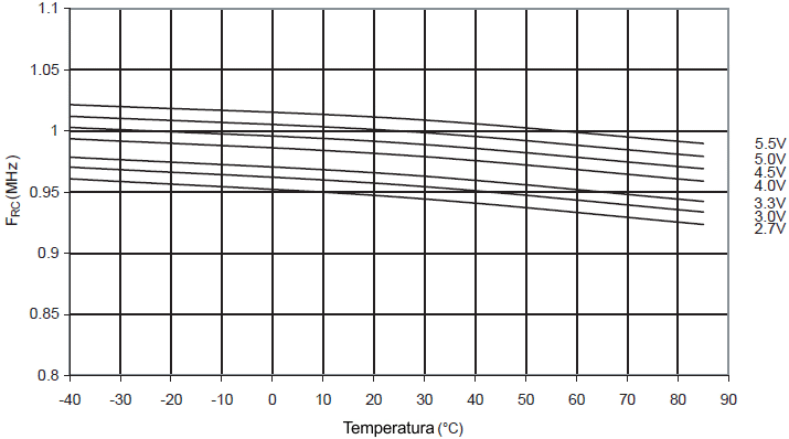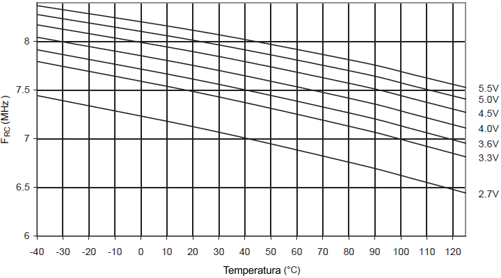 Częstotliwość kalibrowanego oscylatora RC 8MHz w funkcji temperatury