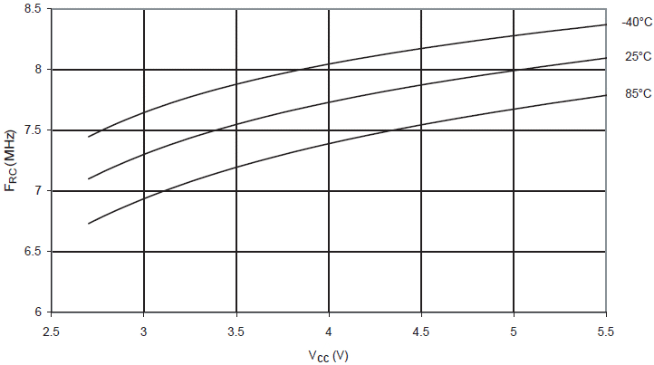 Częstotliwość kalibrowanego oscylatora RC 8MHz w funkcji VCC