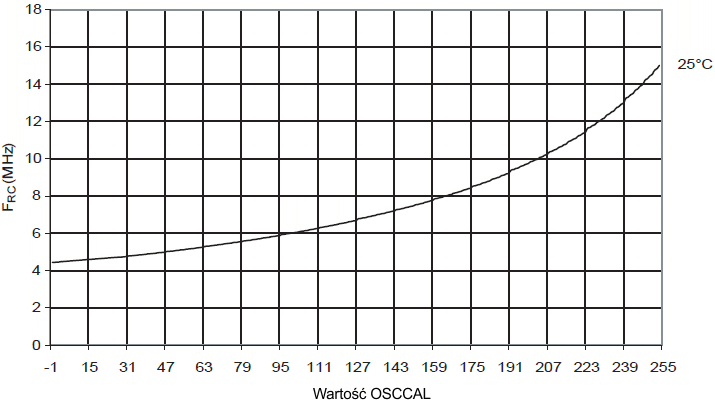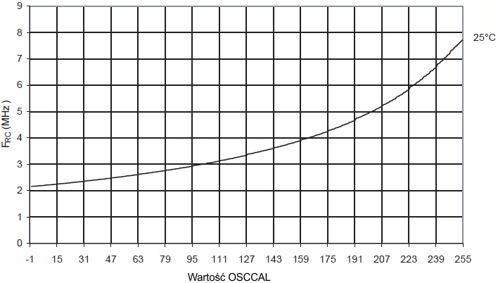 Częstotliwość kalibrowanego oscylatora RC 8MHz w funkcji wartości rejestru