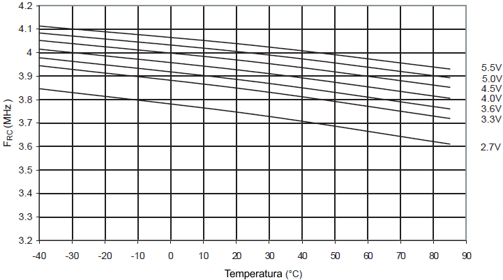 Częstotliwość kalibrowanego oscylatora RC 4MHz w funkcji temperatury
