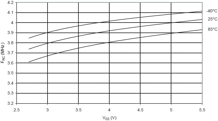 Częstotliwość kalibrowanego oscylatora RC 4MHz w funkcji VCC