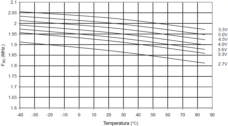 Częstotliwość kalibrowanego oscylatora RC 2MHz w funkcji temperatury