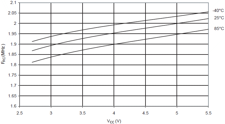 Częstotliwość kalibrowanego oscylatora RC 2MHz w funkcji VCC