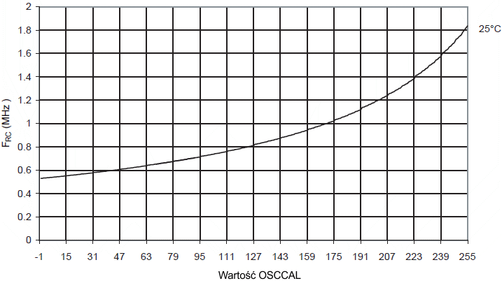 Częstotliwość kalibrowanego oscylatora RC 2MHz w funkcji wartości rejestru