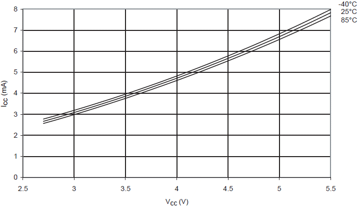 Poniższe wykresy ukazują typowe zachowanie się mikrokontrolera. Danych tych nie testowano podczas produkcji. Wszystkie pomiary poboru prądu dokonano przy wszystkich końcówkach we/wy skonfigurowanych jako wejścia z włączonymi wewnętrznymi opornikami podciągającymi. Jako źródło zegarowe użyto generatora sinusoidalnego z wyjściem typu rail-to-rail.