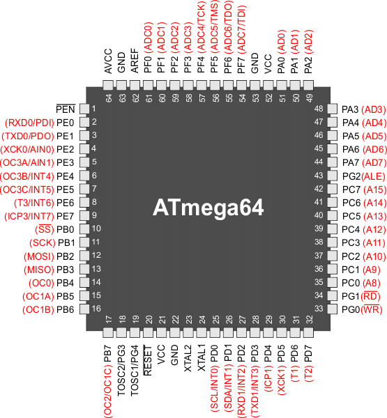 Uwaga: do programowania poprzez szeregowy interfejs SPI mikrokontroler ATmega64 używa końcówek PDI (PE0) i PDO (PE1) zamiast odpowiednio MOSI (PB2) i MISO (PB3).