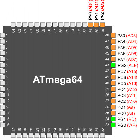 Gdy zostanie uaktywniona pamięć zewnętrzna (ang. eXternal MEMory, XMEM), staje się dostępna przestrzeń adresowa poza wewnętrzną pamięcią SRAM przy użyciu dedykowanych końcówek pamięci zewnętrznej: