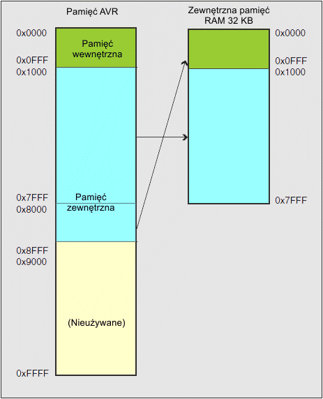 Ponieważ pamięć zewnętrzna jest odwzorowywana w przestrzeni adresowej za pamięcią wewnętrzną (jak na rysunku powyżej), to pamięć zewnętrzna nie jest adresowana przy dostępie do pierwszych 4352 bajtów przestrzeni danych. Może się wydawać, iż te pierwsze 4352 bajty pamięci zewnętrznej jest niedostępne (adresy pamięci zewnętrznej od 0x0000 do 0x10FF). Jednakże przy dołączaniu pamięci zewnętrznej mniejszej od 64 KB, na przykład 32 KB, te komórki są łatwo dostępne po prostu przez adresowanie od 0x8000 do 0x90FF. Ponieważ bit A15 nie jest połączony z pamięcią zewnętrzną, to adresy od 0x8000 do 0x90FF pojawiają się dla pamięci zewnętrznej jako adresy od 0x0000 do 0x10FF. Adresowanie ponad adres 0x90FF nie jest zalecane, ponieważ zaadresuje komórkę pamięci zewnętrznej, do której jest już dostęp pod innym (niższym) adresem. Dla programu aplikacji zewnętrzna pamięć 32 KB pojawi się jako 32 KB liniowa przestrzeń adresowa od 0x1100 do 0x90FF. Zilustrowane to zostało na poniższym rysunku.
